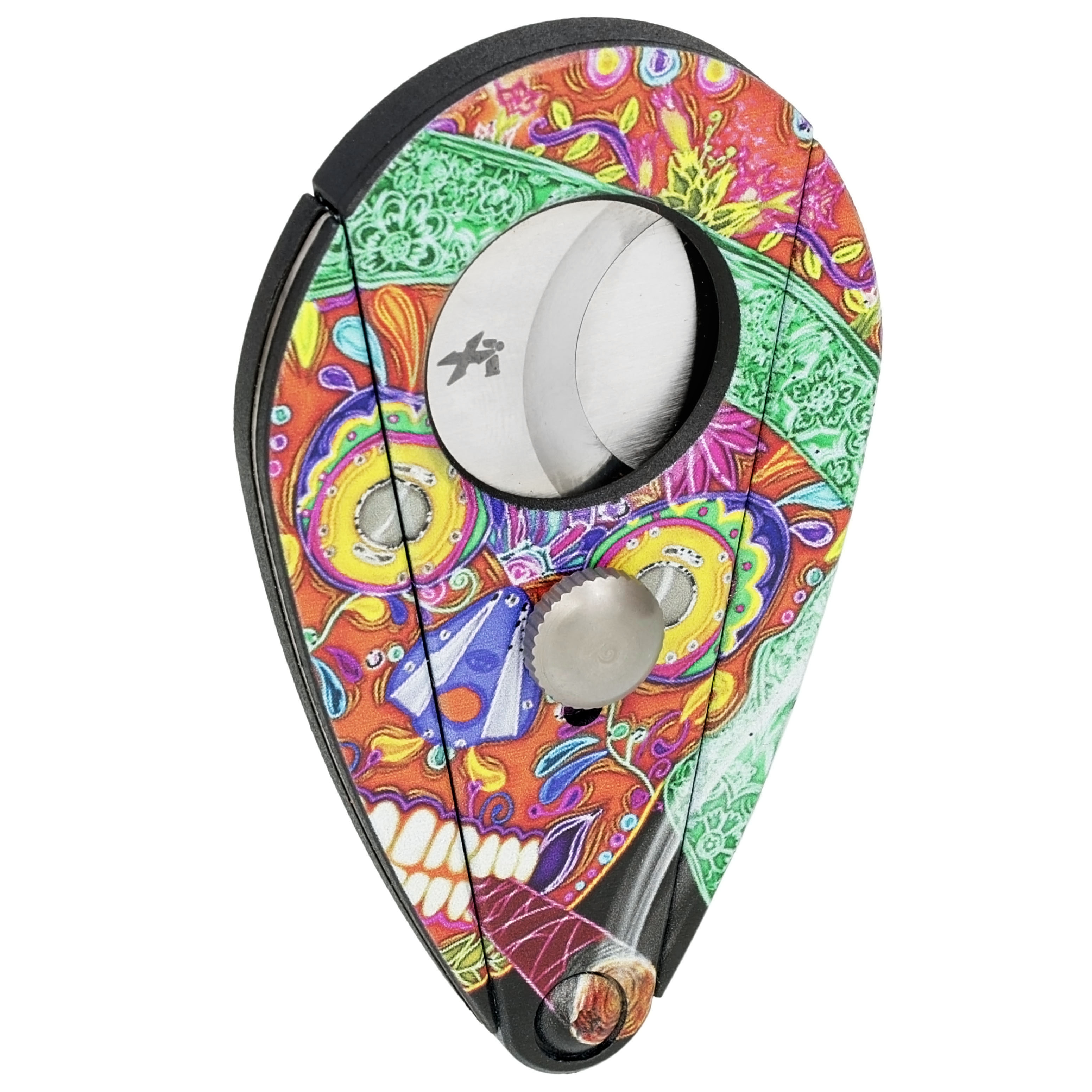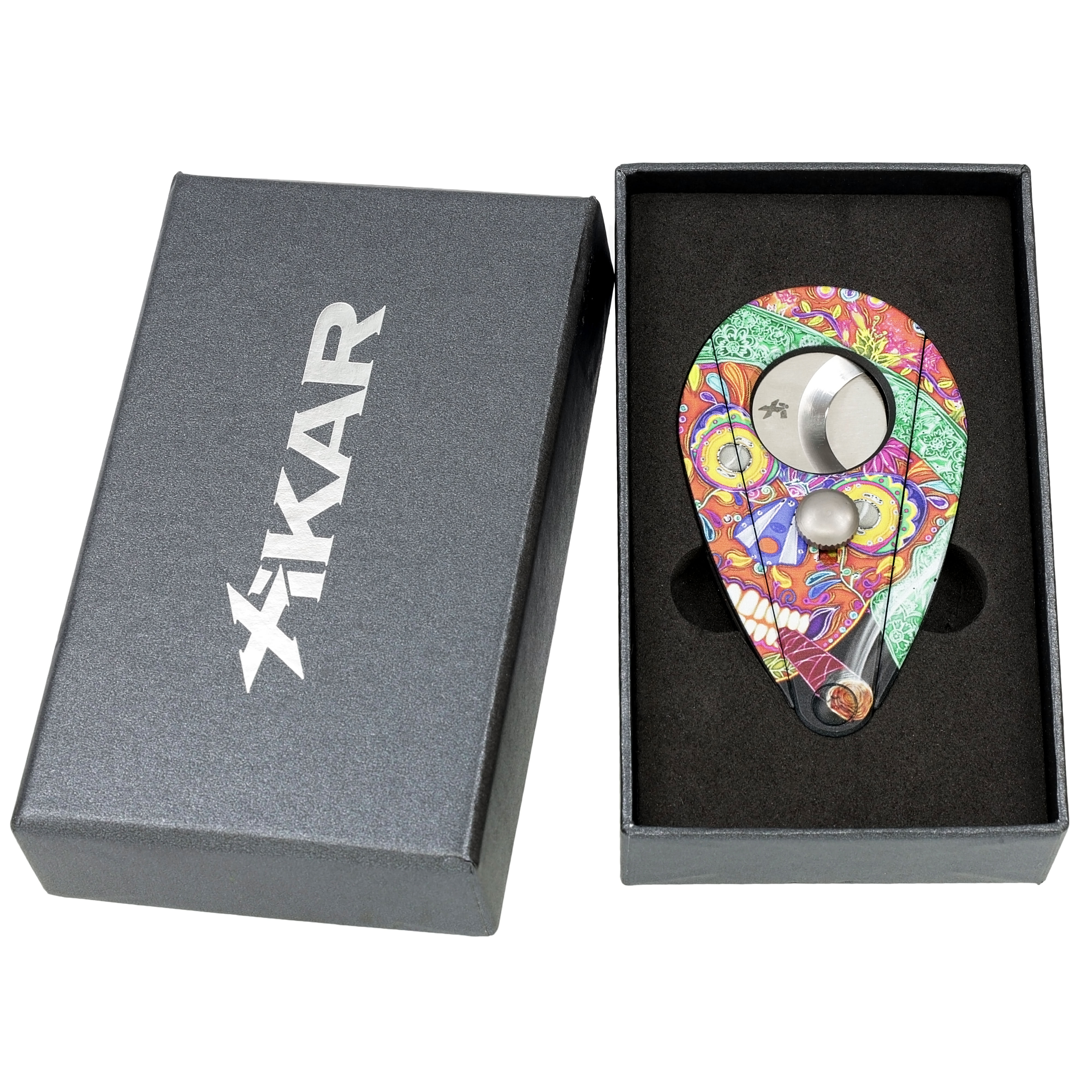 This eclectic cutter’s design was inspired from the Dia de los Muertos, which is a Mexican holiday that celebrates friends and family members who have passed on. Globally recognized artist Jahnvi Arora, who is based in India, designed the cutter. Its double guillotine stainless steel blades can easily cut cigars up to a 60-ring gauge. The blades are contained in a durable, lightweight fiberglass composite body. Gift boxed. Backed by Xikar's trusted limited lifetime warranty.