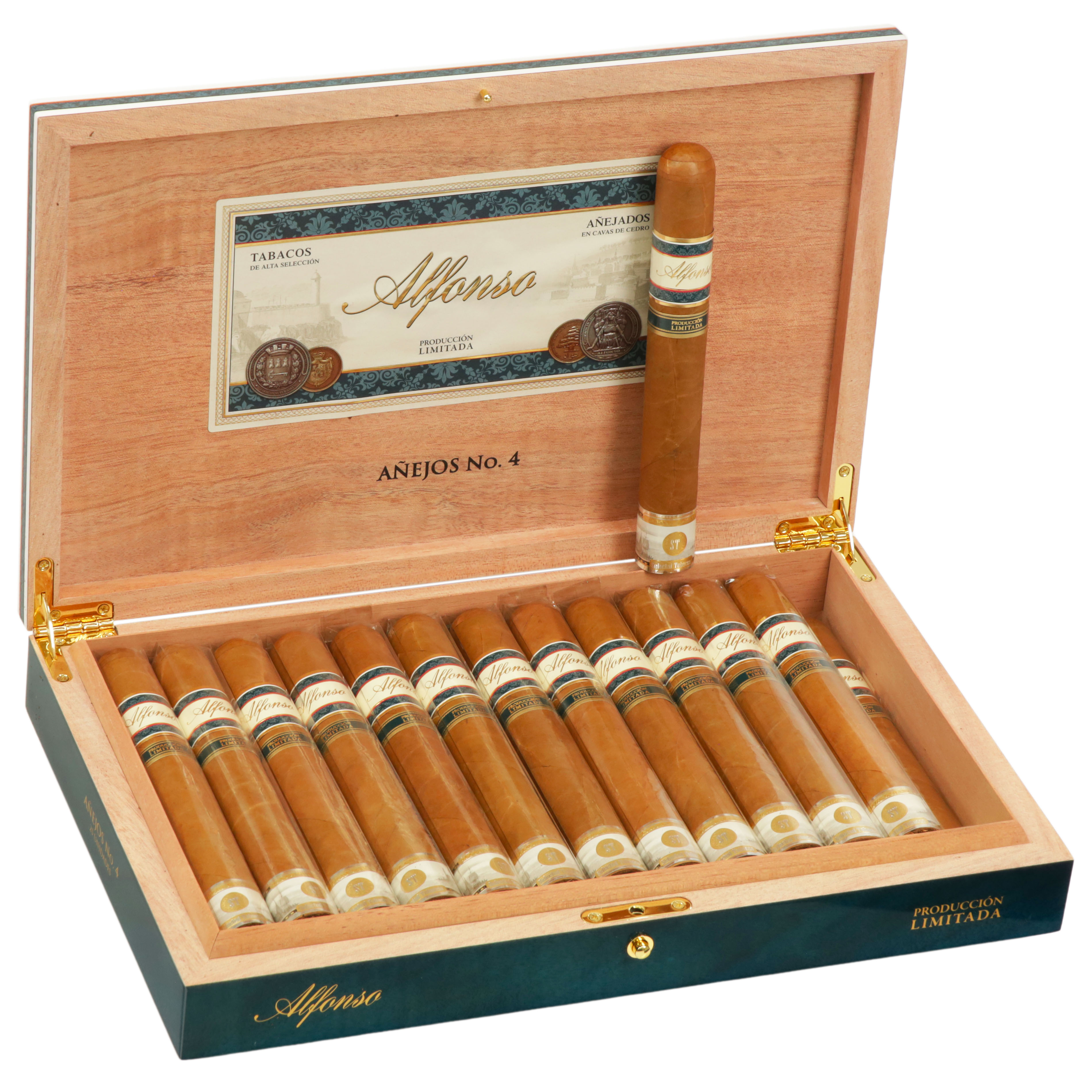 Handmade at the Tabacos de Costa Rica factory, the Alfonso Anejo No. 4 cigars are made in limited batches. An Ecuadorian Connecticut wrapper and binder cover fillers from Nicaragua and Peru and uses cedar and French oak to age the cigars for 5 years.