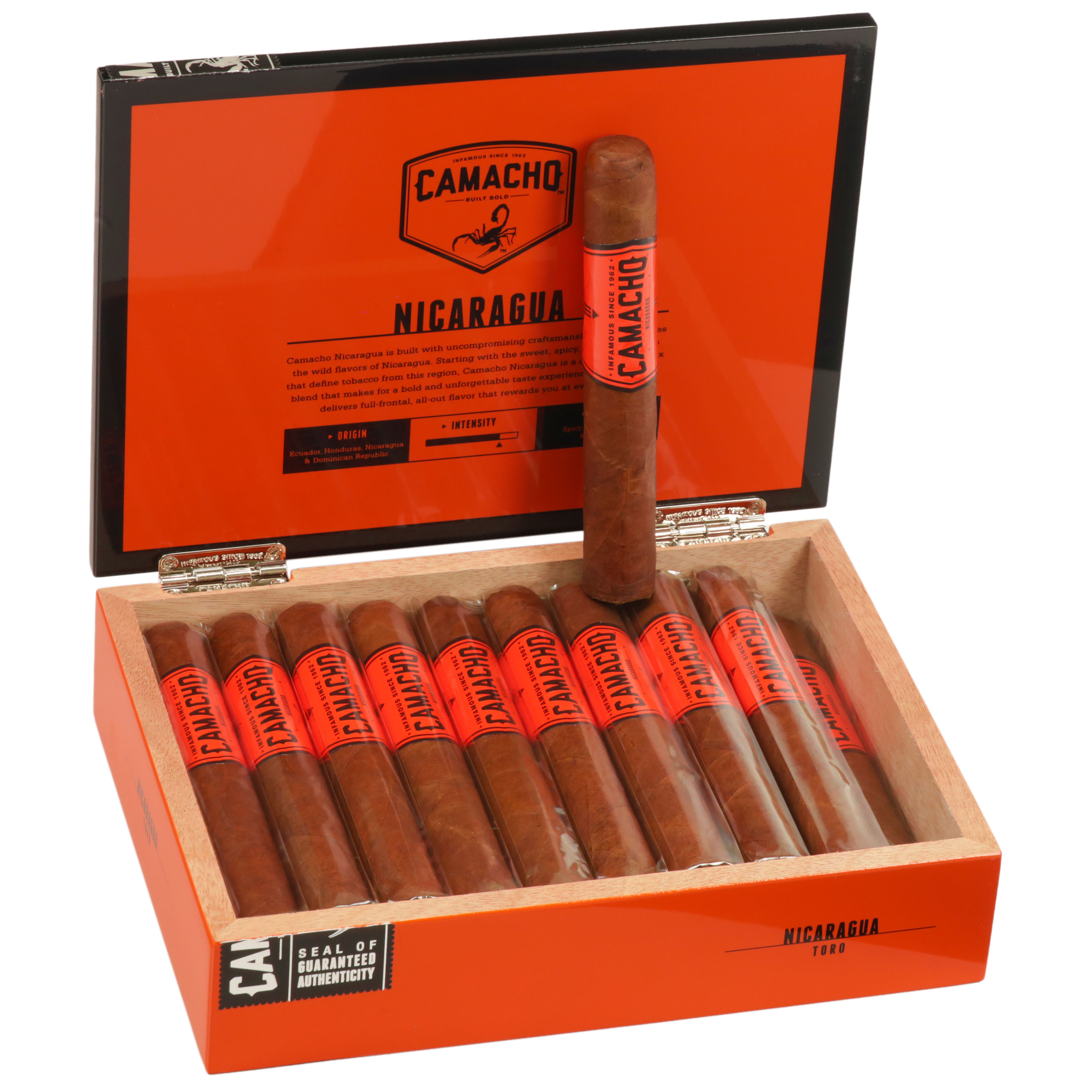 A full-strength yet flavorful cigar with notes of oak and leather with an underlying sweetness. Its Ecuadorian wrapper covers a Honduran binder and Honduran, Nicaraguan and Dominican filler leaves. The Camacho Nicaragua Toro is handmade in Honduras by Davidoff.