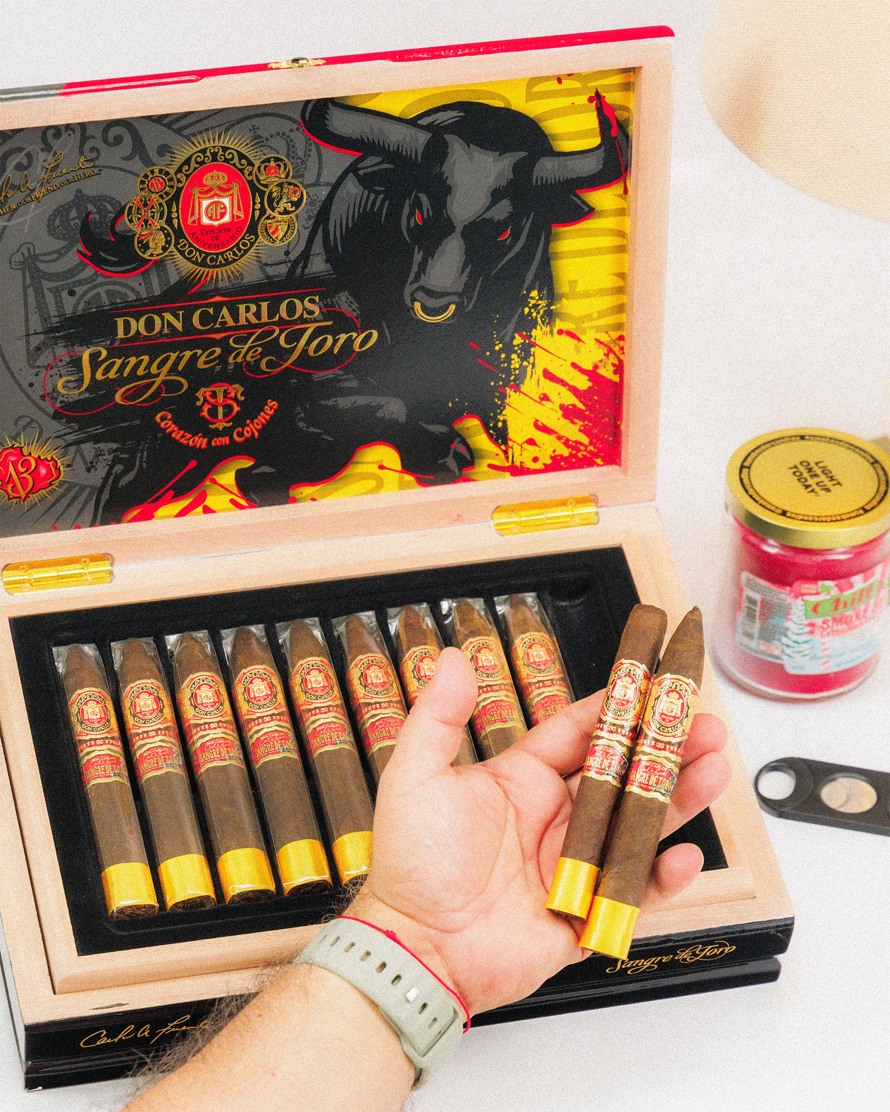 Don Carlos Sangre de Toro is Fuente’s latest extension of the Don Carlos line. The blend features Fuente’s classic Dominican binder and fillers, grown at Chateau de la Fuente; however, for the first time in history, the Fuente family is using a Mexican San Andres wrapper. The Sangre de Toro name, meaning “bull’s blood,” is a nod to the strength and intensity the family was trying to achieve with this cigar, but the Dominican fillers ensure the cigar isn’t bitter or overpowering.