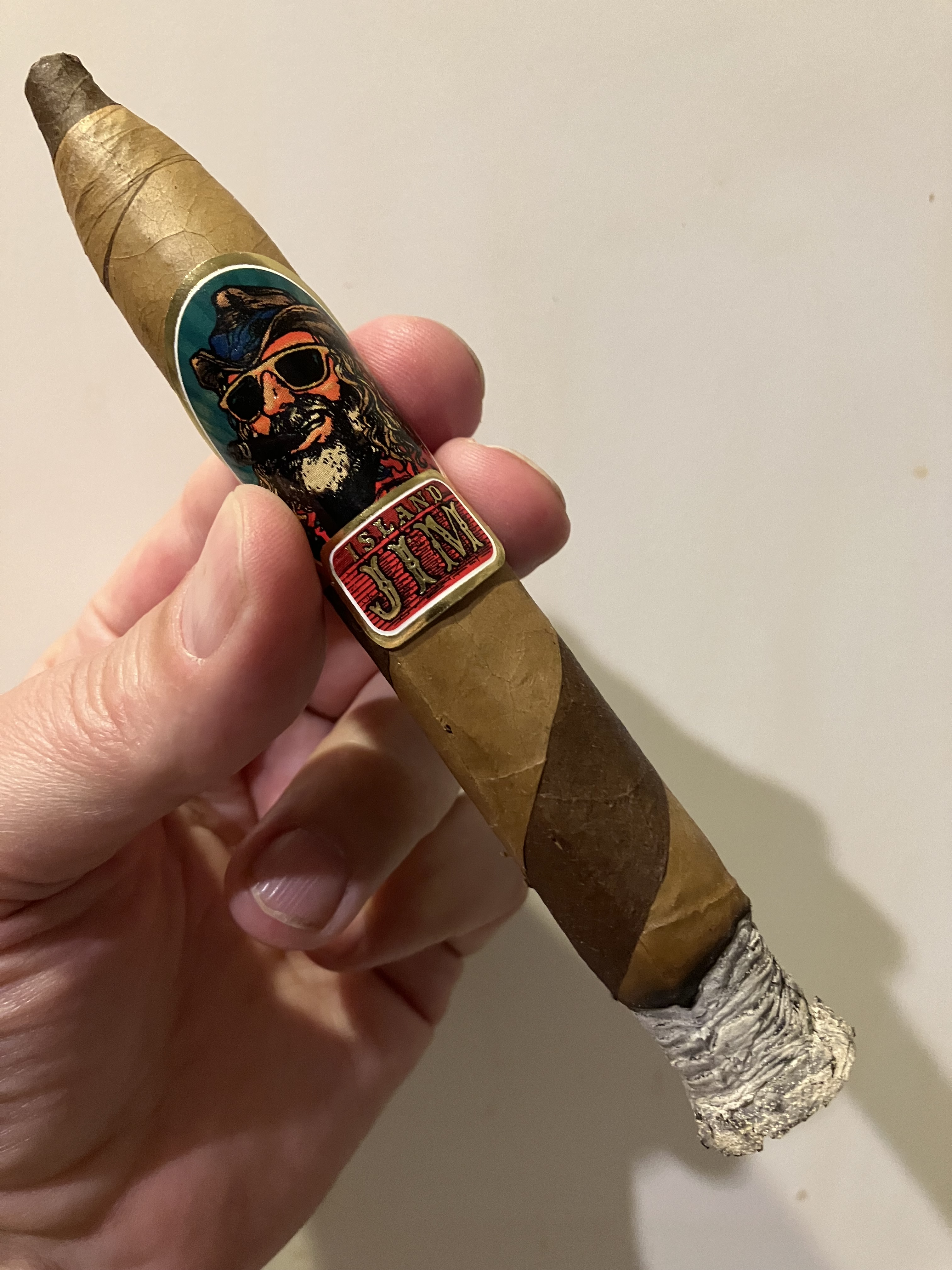 The Island Jim #2 Barber Pole is a visually striking cigar that combines artistry with a complex smoking experience. Crafted by Oscar Valladares in collaboration with "Island Jim" Robinson (yes, he is real). This cigar features a dual wrapper made of Connecticut and Corojo tobaccos. The shaggy foot isn't just handsome, it is an interesting opportunity to access the taste of the filler tobaccos separate from the full blend. The transition as the burn passes the shaggy foot is a wonderful touch. A unique stick with an amazing shtick.