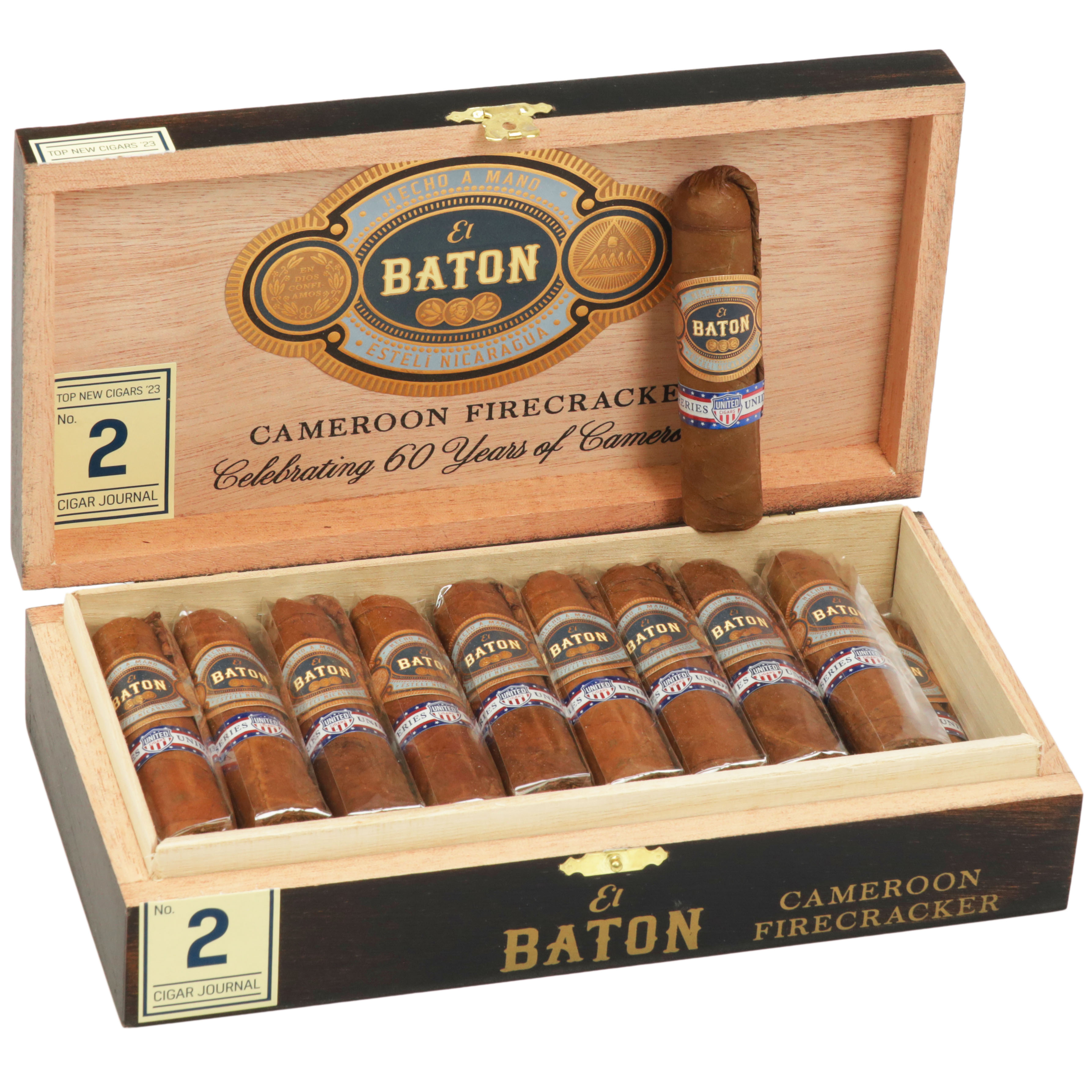 The medium-bodied El Baton Cameroon Firecracker delivers flavors of spice, cedar, earth, and a touch of sweetness in a compact petit robusto. Handcrafted at J.C. Newman’s PENSA factory in Estelí, Nicaragua, it features an African Cameroon wrapper over Nicaraguan binder and filler, finished with the Firecracker series’ signature pigtail “fuse” cap. Produced in just 500 boxes, this limited release marks 60 years since Newman's introduction of Cameroon tobacco in premium cigars. Time flies when it tastes that good!