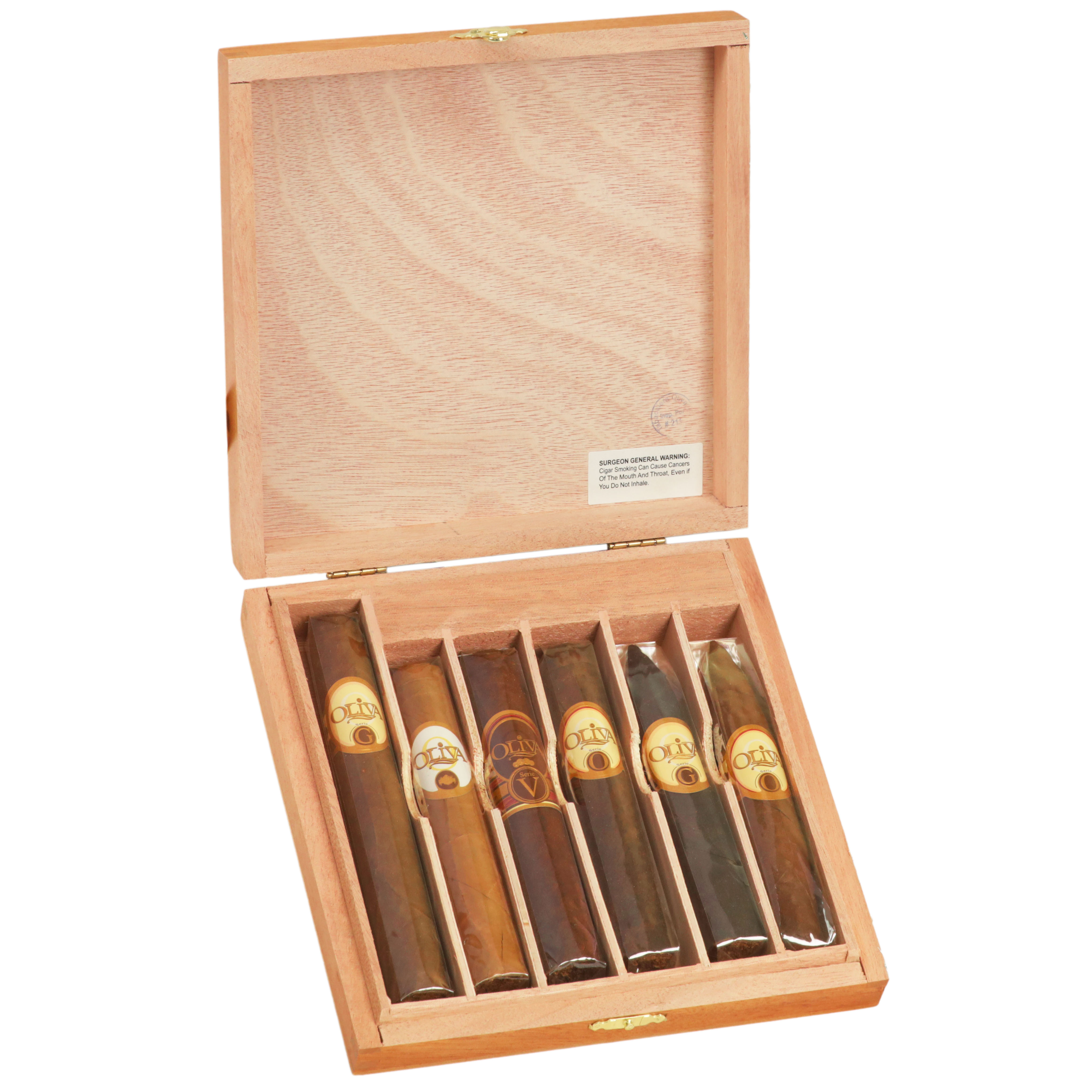 This cigar contains one each of: G Maduro Belicoso, G Toro, O Perfecto, O Maduro Robusto, V Double Robusto and Connecticut Reserve Robusto.