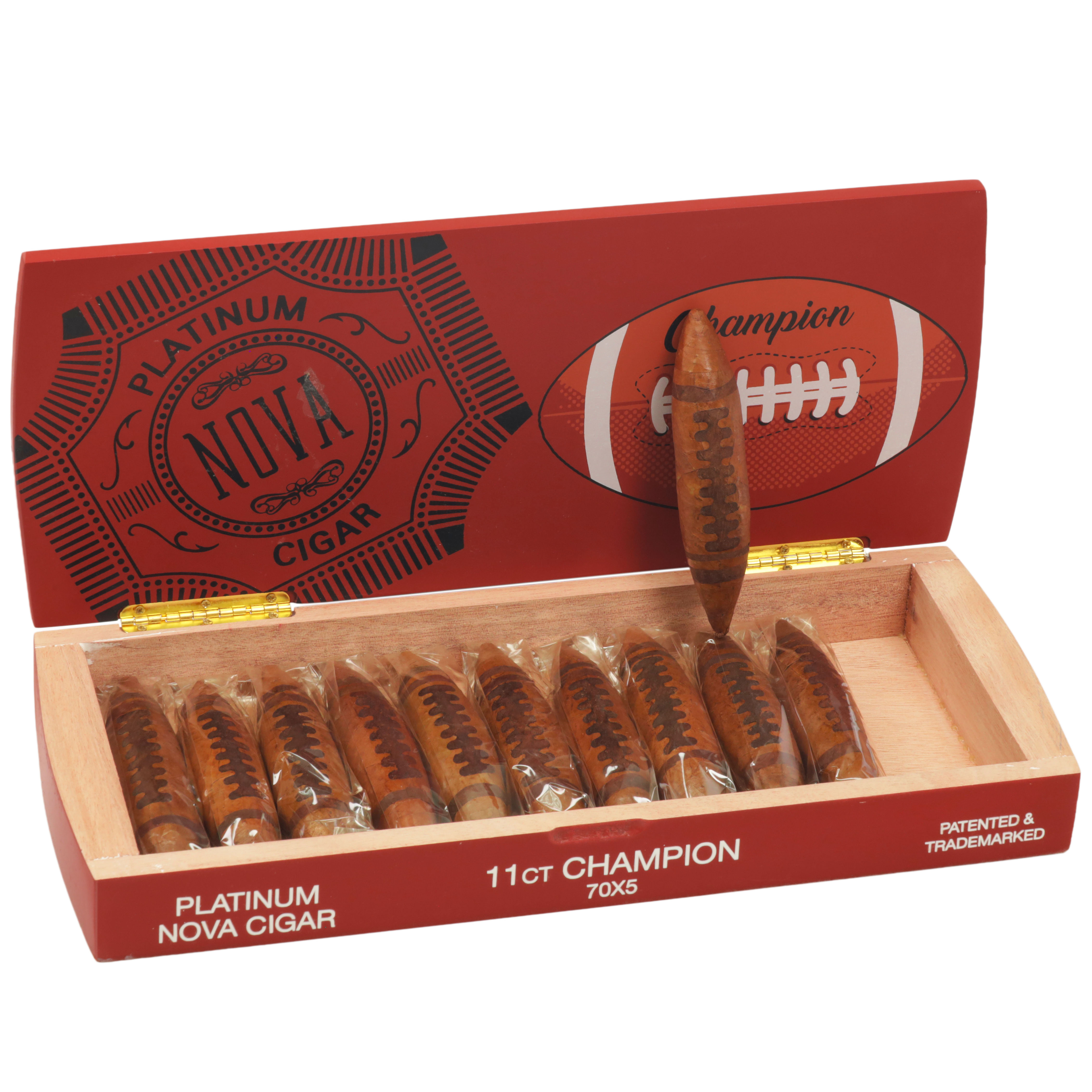 A full-bodied smoke that will pleasingly blitz your palate with creamy and sweet notes and touches of spice and coffee. Its smooth Ecuadorian Habano 2000 wrapper has strips of a contrasting wrapper leaf arranged to make this “MVP” cigar look like a football. Underneath this game-winning wrapper is a binder and filler made of leaves from the Dominican Republic. This is a limited release cigar. Only 250 boxes of 11 cigars per box were made. Handmade in the Dominican Republic. Whether you’re watching the “Big Game” or running a few scrimmages in your backyard, make sure the Platinum Nova Series Champion Football Cigar is your #1 smoking draft pick.
