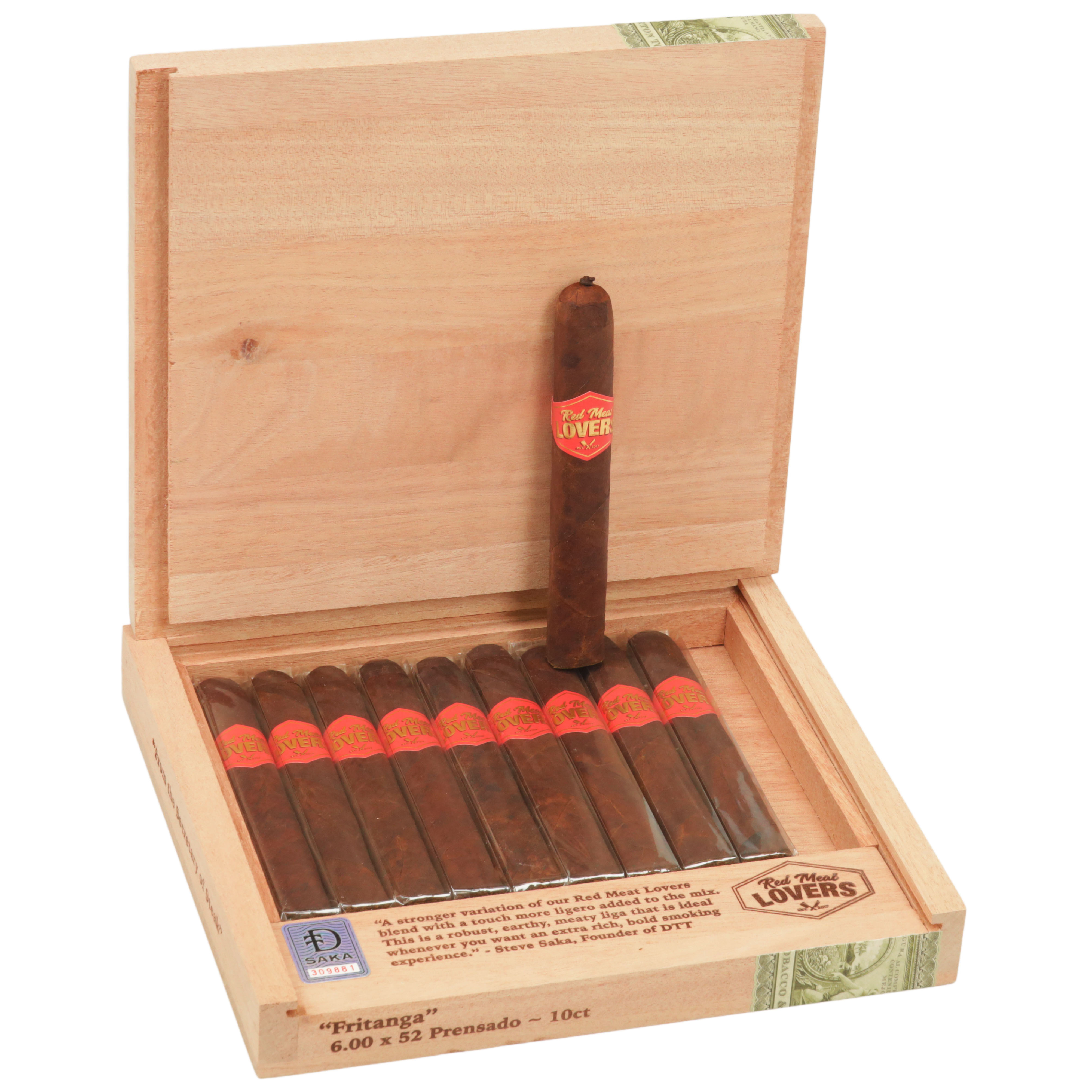 Bold flavors of earth, nuts, and black pepper ride over creamy oak and subtle sweetness in this hearty smoke. Wrapped in a toothy U.S. Connecticut Broadleaf with a San Andrés binder and Nicaraguan/Pennsylvania fillers, the Fritanga size adds extra ligero for a spicier, beefier kick. Handcrafted in Nicaragua, Red Meat Lovers was blended by Steve Saka to be the perfect partner to a steak.