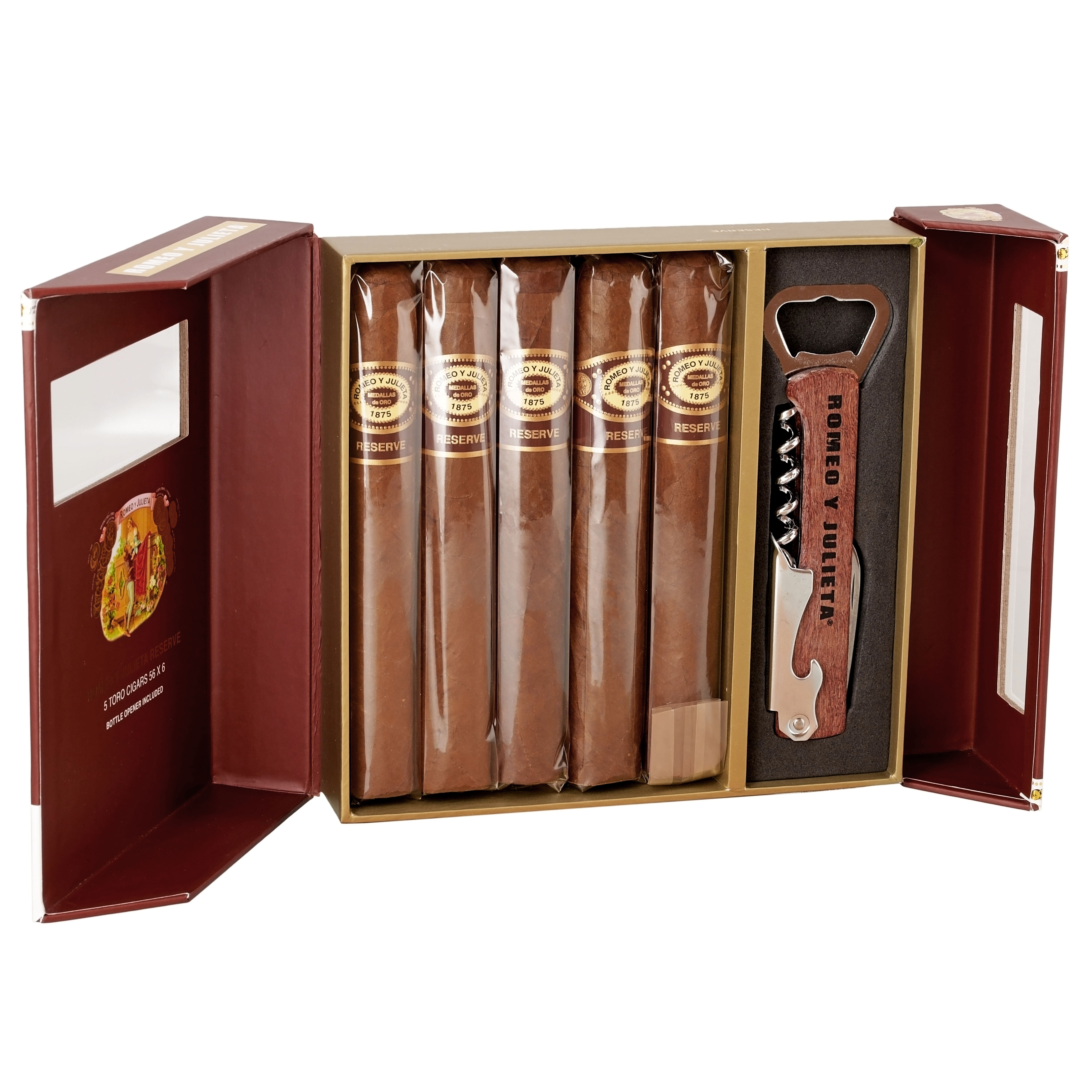 If you like full-bodied cigars you are going to love this sampler. It comes with five (5) Romeo y Julieta Reserve Toro (6” * 56) cigars. The Reserve is considered to be one of Romeo y Julieta’s strongest cigars. Dressed in a milk chocolatey Nicaraguan wrapper, the Reserve, when lit, delivers big hearty flavors with noticeable notes of leather, chocolate, and spice. Plus! This must-have sampler includes a convenient multi-functional beer and wine key that has a cork screw, bottle opener, and knife. All tucked inside a handsomely designed gift box.