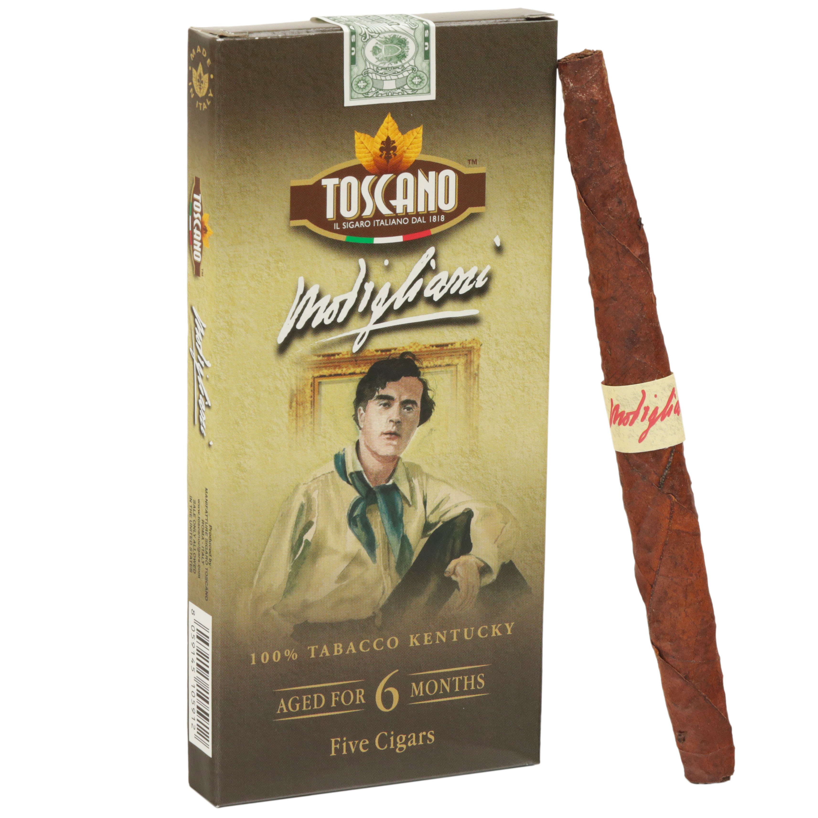 The Toscano Modigliani is a full-bodied slim panatela that is machine made in Italy. It sports a USA Kentucky wrapper draped over a filler made of Italian and Kentucky tobaccos. The Toscano Modigliani has a sweet flavor profile underscored by notes of fruit and cedar.