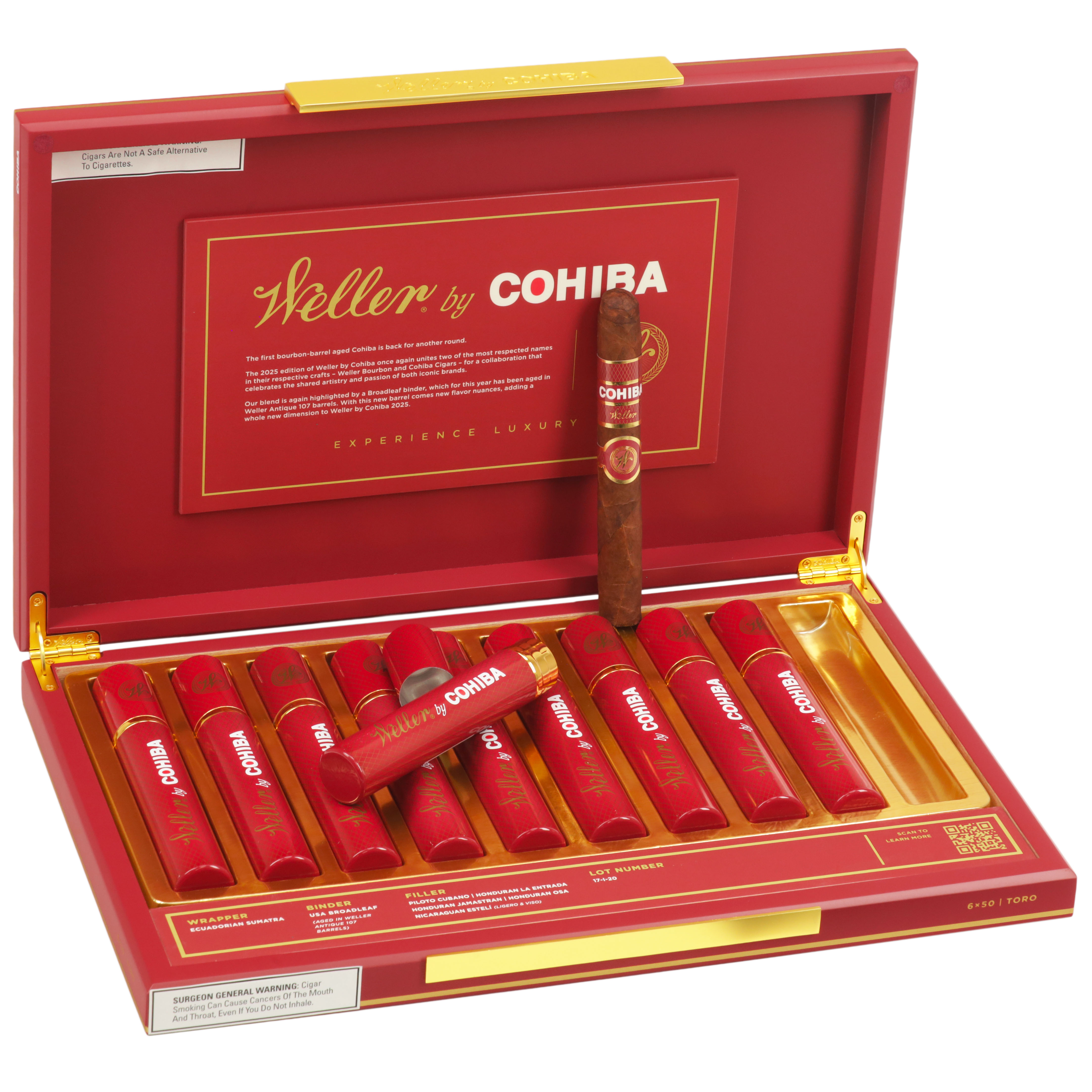 Weller by Cohiba 2025 unites two celebrated traditions, premium cigarmaking and Kentucky bourbon craftsmanship. Handrolled in the Dominican Republic, it features an Ecuadorian Sumatra wrapper, a U.S. Broadleaf binder aged in Weller Antique 107 barrels, and fillers from the Dominican Republic, Honduras, and Nicaragua. This rare collaboration delivers a refined, complex profile that highlights the harmony of tobacco and bourbon heritage in a truly limited edition release.