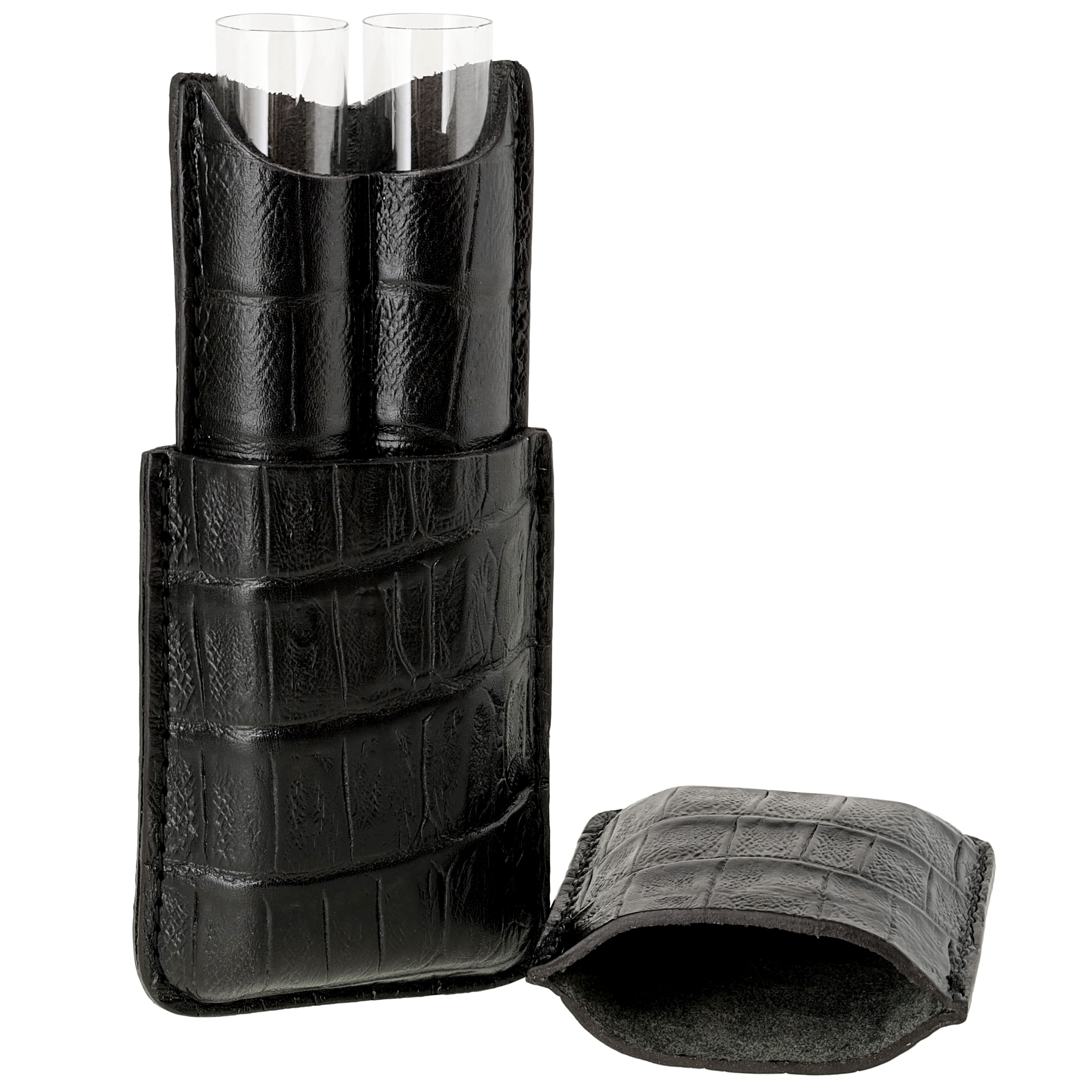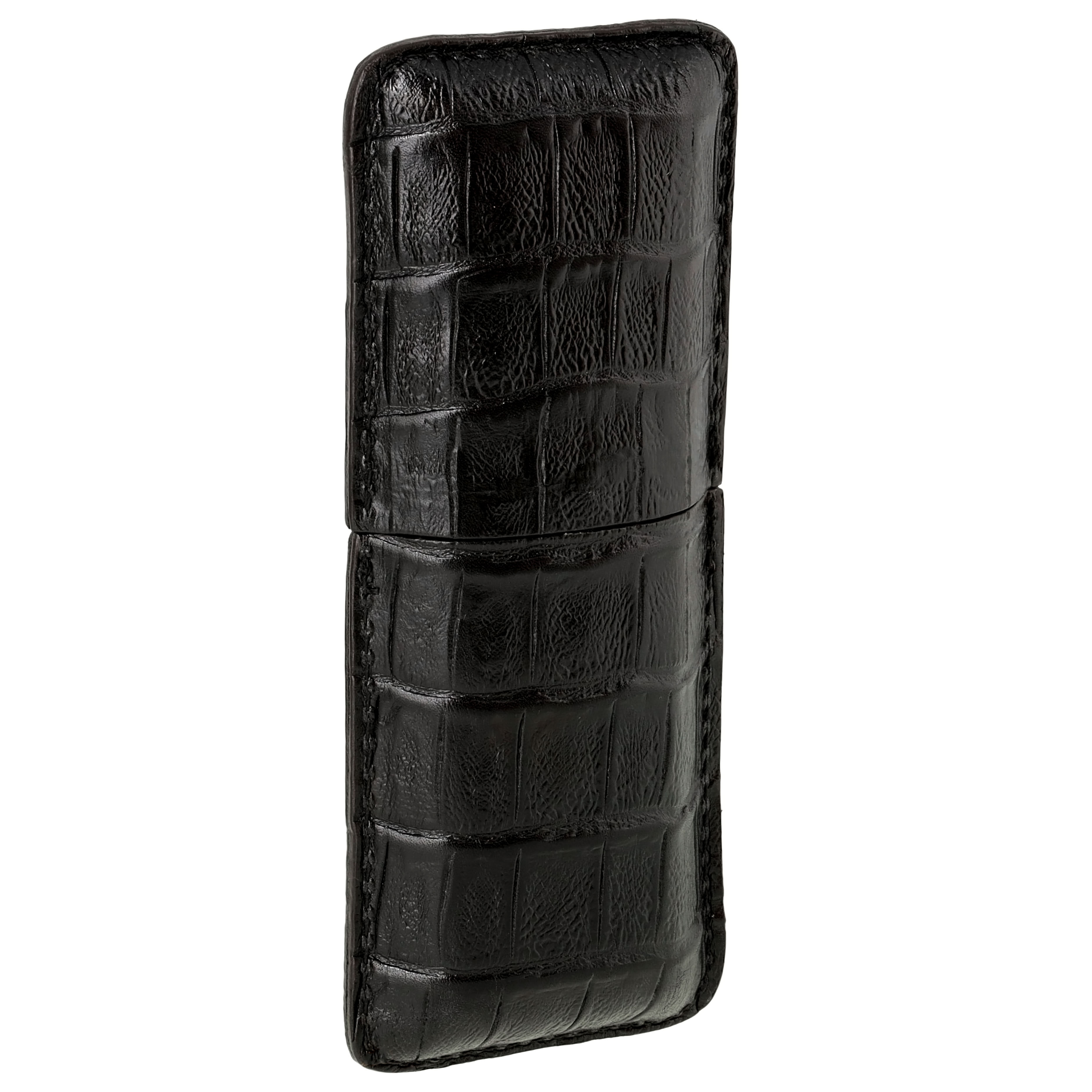 Made in the USA! Certified Italian leather, Vegan Tanned leather, Crocodile stamped cowhide, 100% Leather construction, heavy nylon stitching. Available in colors and 3 finger cases. Maximum size of cigars: 6.5"/ 60 Gauge. Comes with certificate of Authenticity. Eco-friendly.