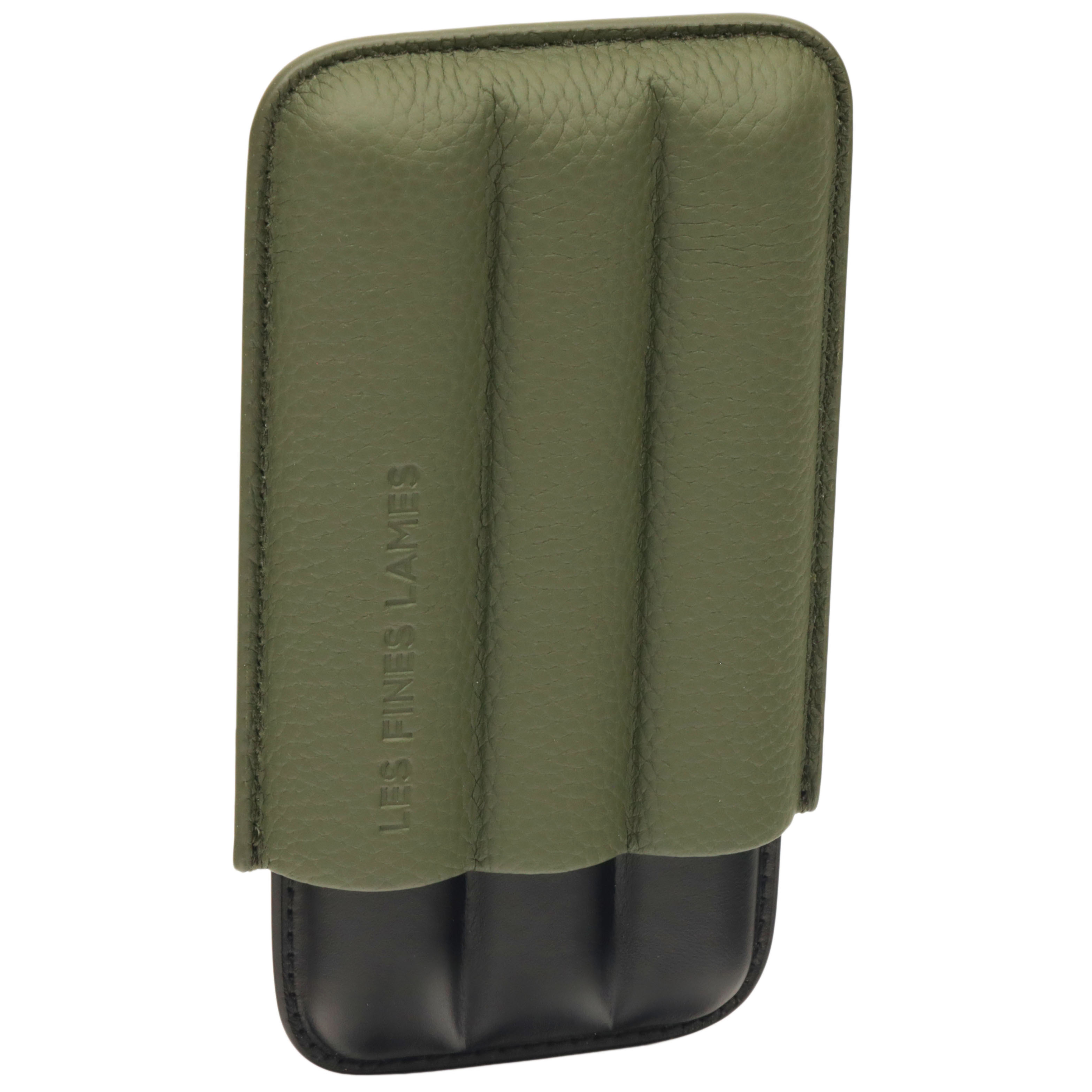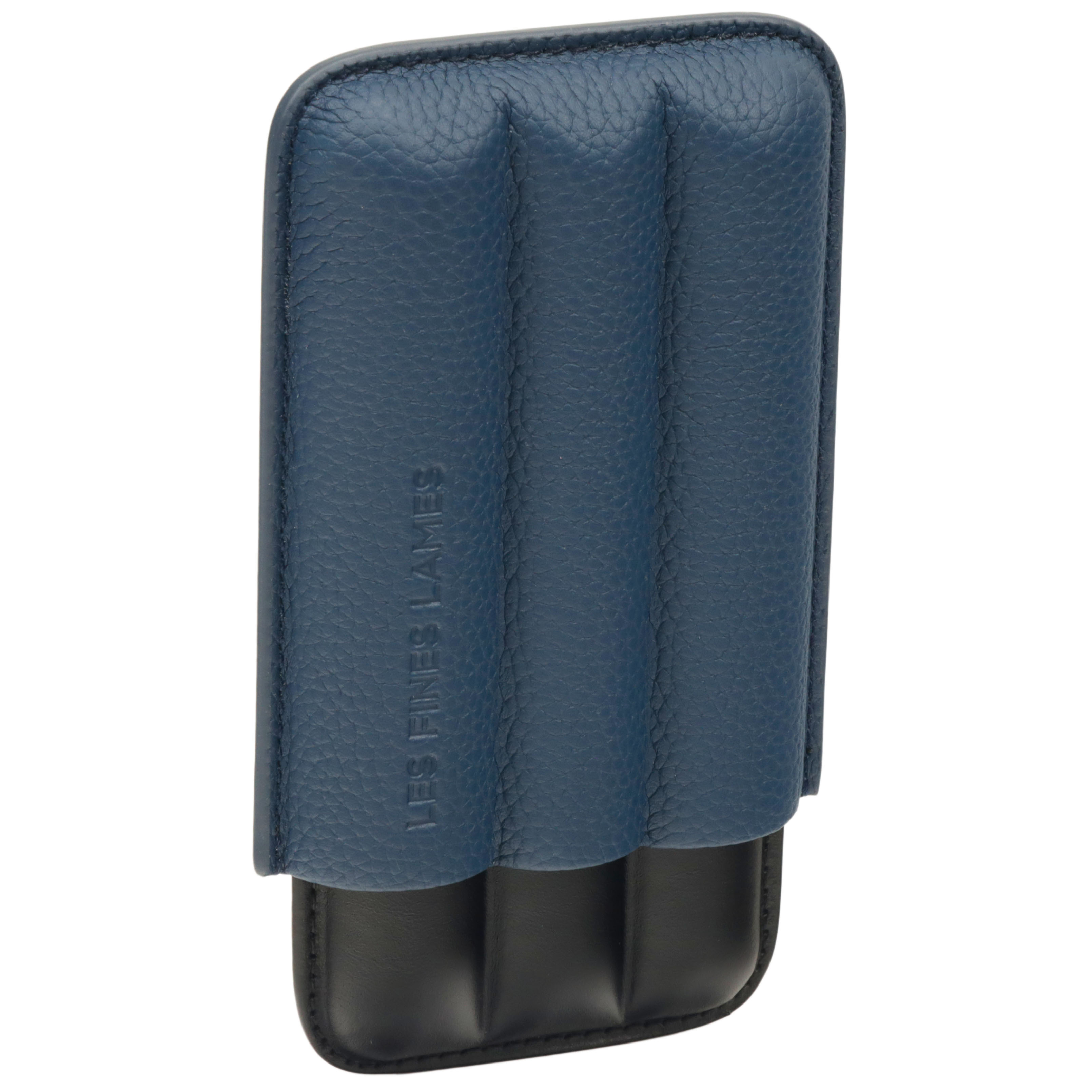 The TRIO Cigar Case by Les Fines Lames is a refined travel case crafted from quality textured leather with a smooth full-grain leather base, designed to carry up to three cigars (up to 52 ring gauge) securely and in style. Embossed with the Les Fines Lames logo, this durable accessory blends practicality with understated elegance. Dimensions: 6.3" × 3.5" × 1.2".