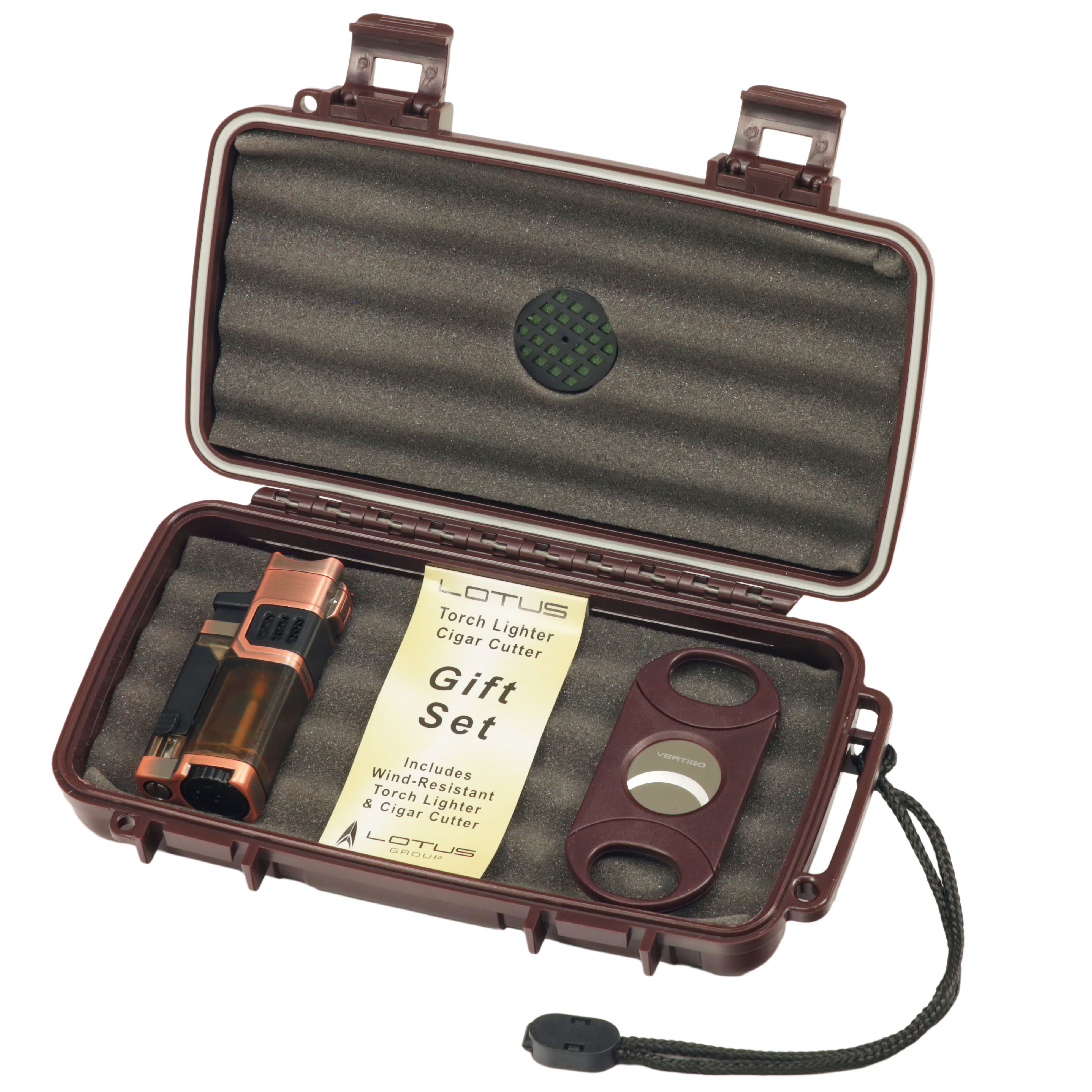 This gift set covers every step of the ritual, minus the right cigar, good company, and a splash of butane. The Regal lighter, finished in copper, delivers a wind-resistant torch flame and includes a convenient spring-loaded punch on the base. It pairs with the Big Boy cutter, built with razor-sharp dual blades that cleanly handle up to a 64-ring gauge. Packed inside a travel case, the set is ready to go wherever your smokes take you.