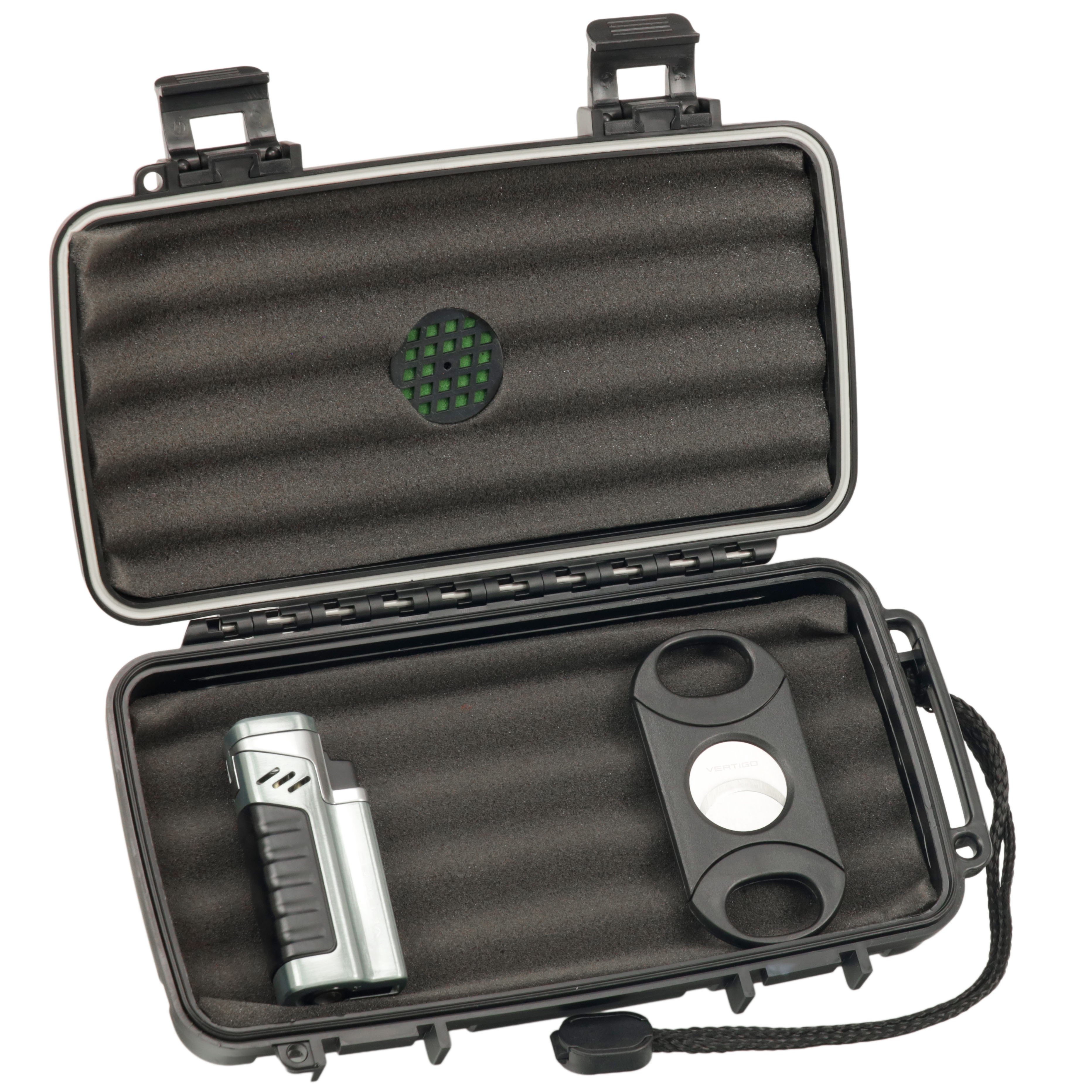 The Vertigo Renegade gift set will not only save you money, but also blow your mind. This cool gift set includes a crushproof, waterproof 5-cigar travel case, a Vertigo Renegade quad torch flame lighter and a Vertigo Big Boy guillotine cutter with stainless steel blades that can cut cigars up to a 64 ring gauge. Warranty by Vertigo. The Vertigo Renegade quad torch lighter features a fold-out cigar punch and can be used at an altitude of up to 8,000 feet. This deal is too good to pass up!