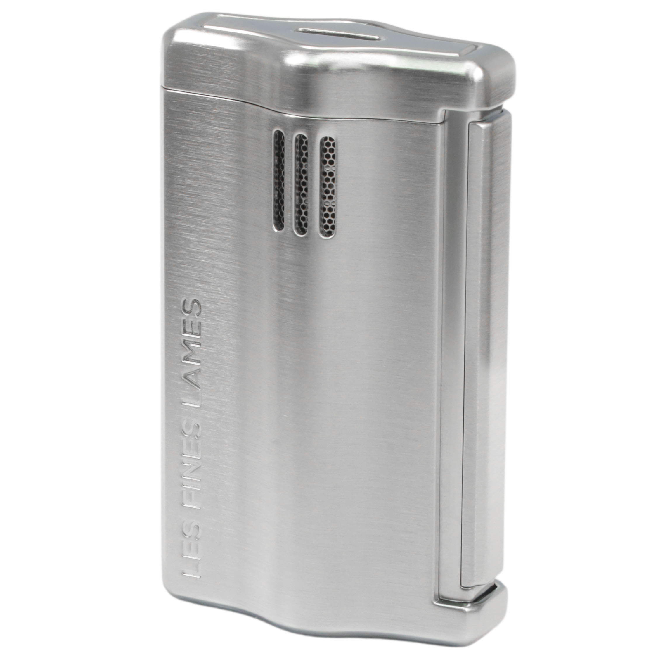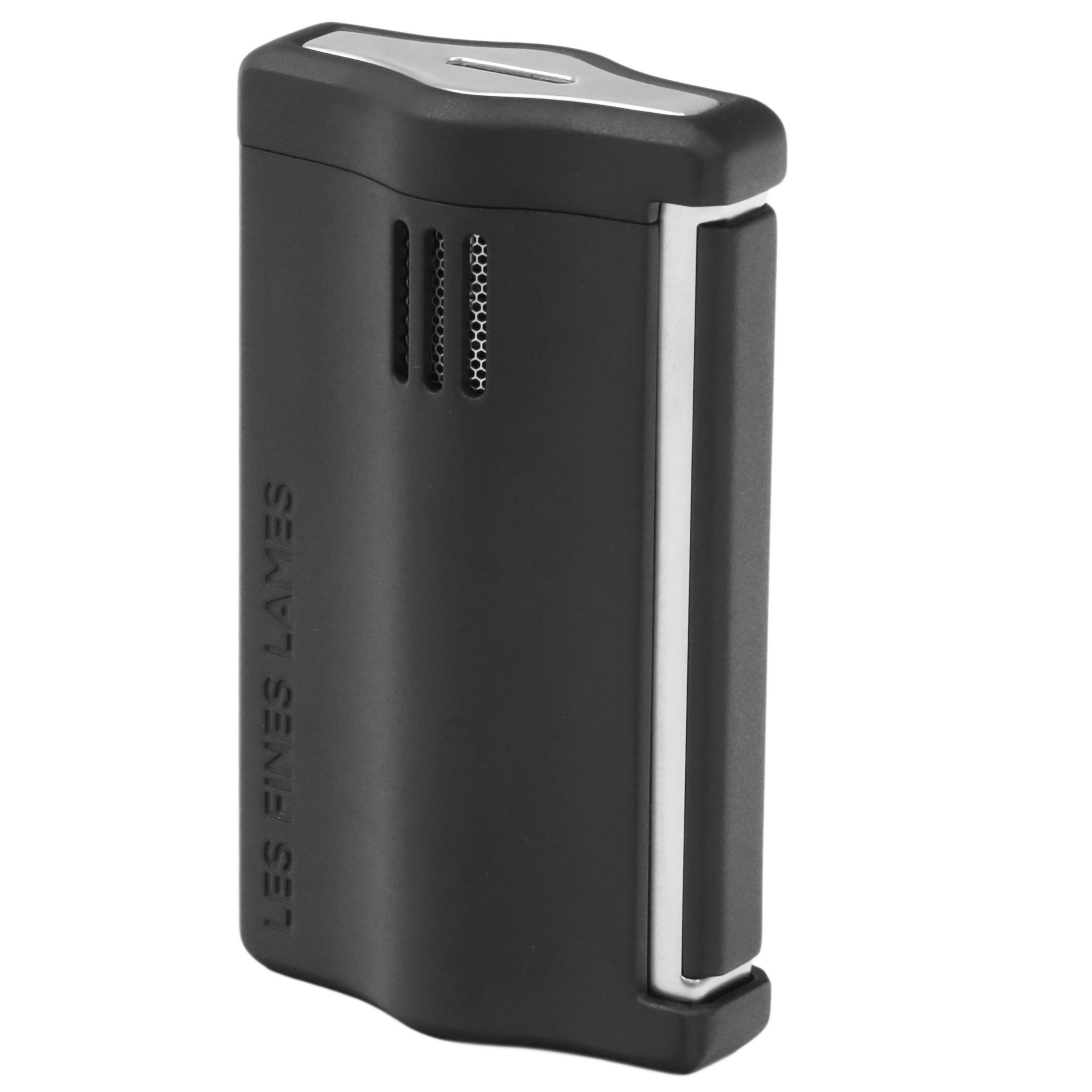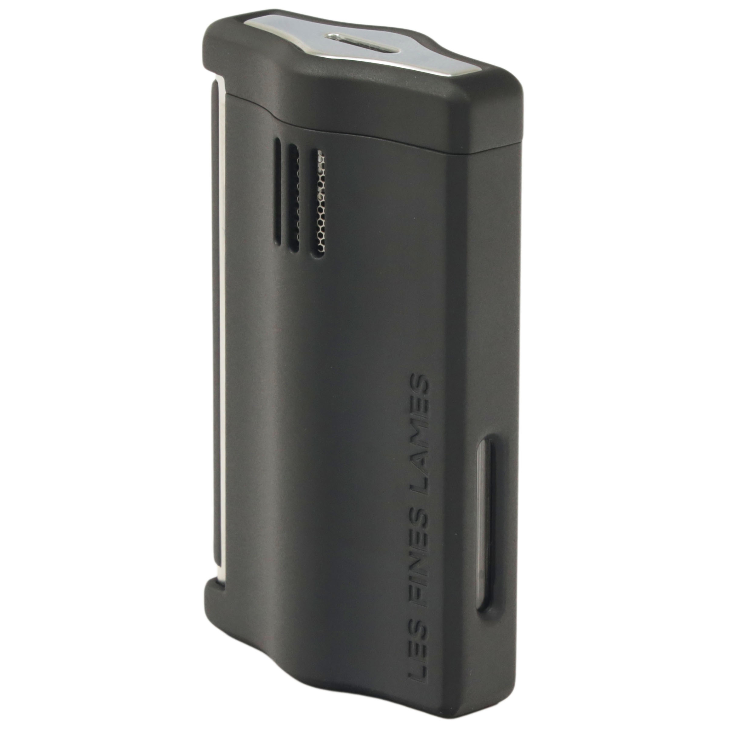 The Le FEU RS is a cigar band-inspired lighter designed to elevate the ritual of cigar enjoyment with a bold silhouette and premium finish. It delivers a powerful flat flame with its side-squeeze ignition, supported by an ergonomic grip, adjustable flame settings, and a gas tank window for easy monitoring, and is backed by a two-year international warranty. Ships empty. Butane sold separately. Dimensions: 2.6" x 1.6" x 0.4".